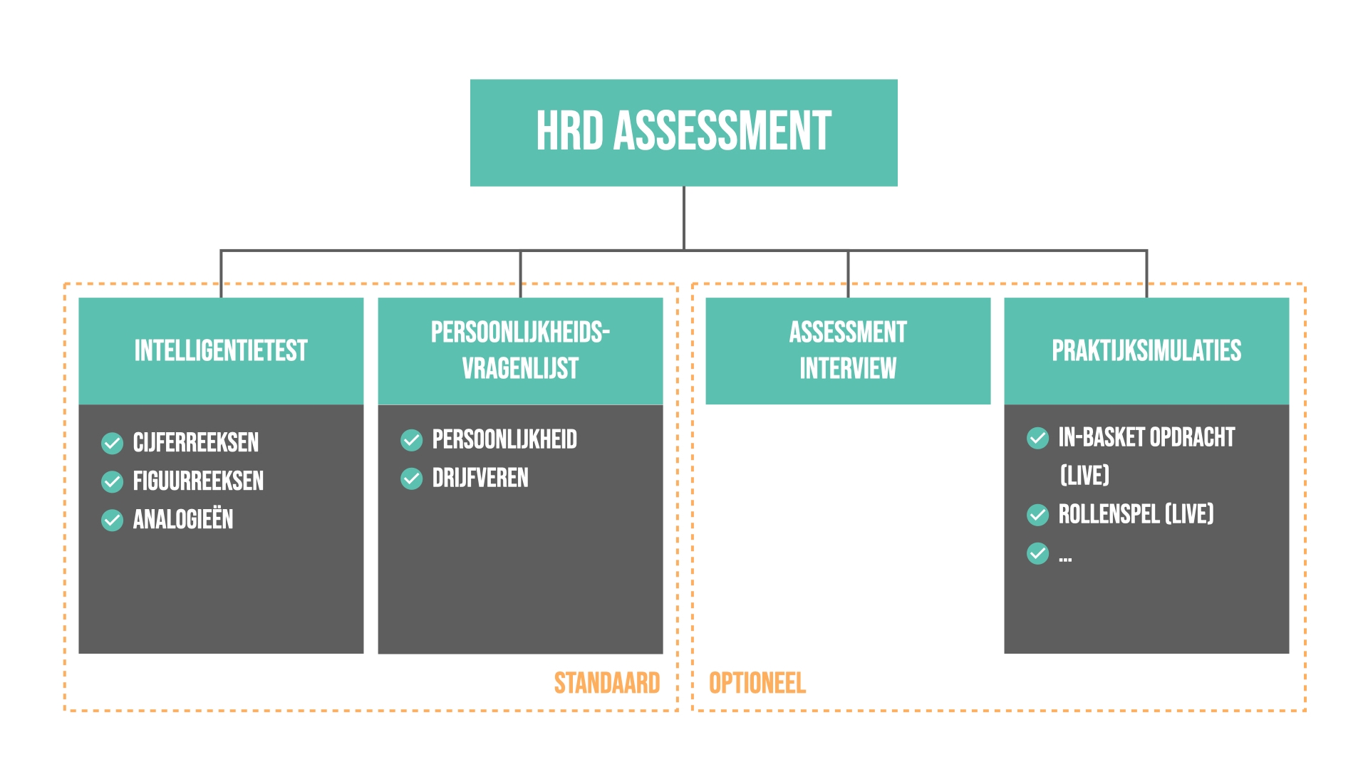 Hieronder staan de verschillende deeltesten van het HRD assessment. Elke deeltest bevat zo’n 20 á 30 vragen en duurt in totaal zo’n 15 tot 20 minuten.