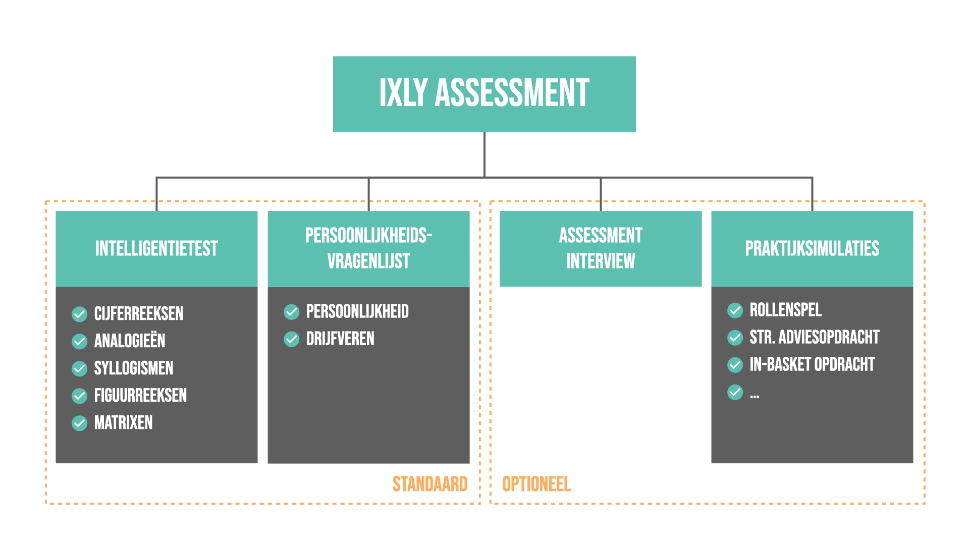 Ervaring leert dat het standaard IXLY assessment uit ten minste drie online onderdelen bestaat, namelijk: een intelliegentietest, een drijfverentest en een persoonlijkheidsvragenlijst. Daarnaast kunnen een aantal optionele onderdelen worden toegevoegd om het assessment specifiek te maken voor een bepaalde functie.