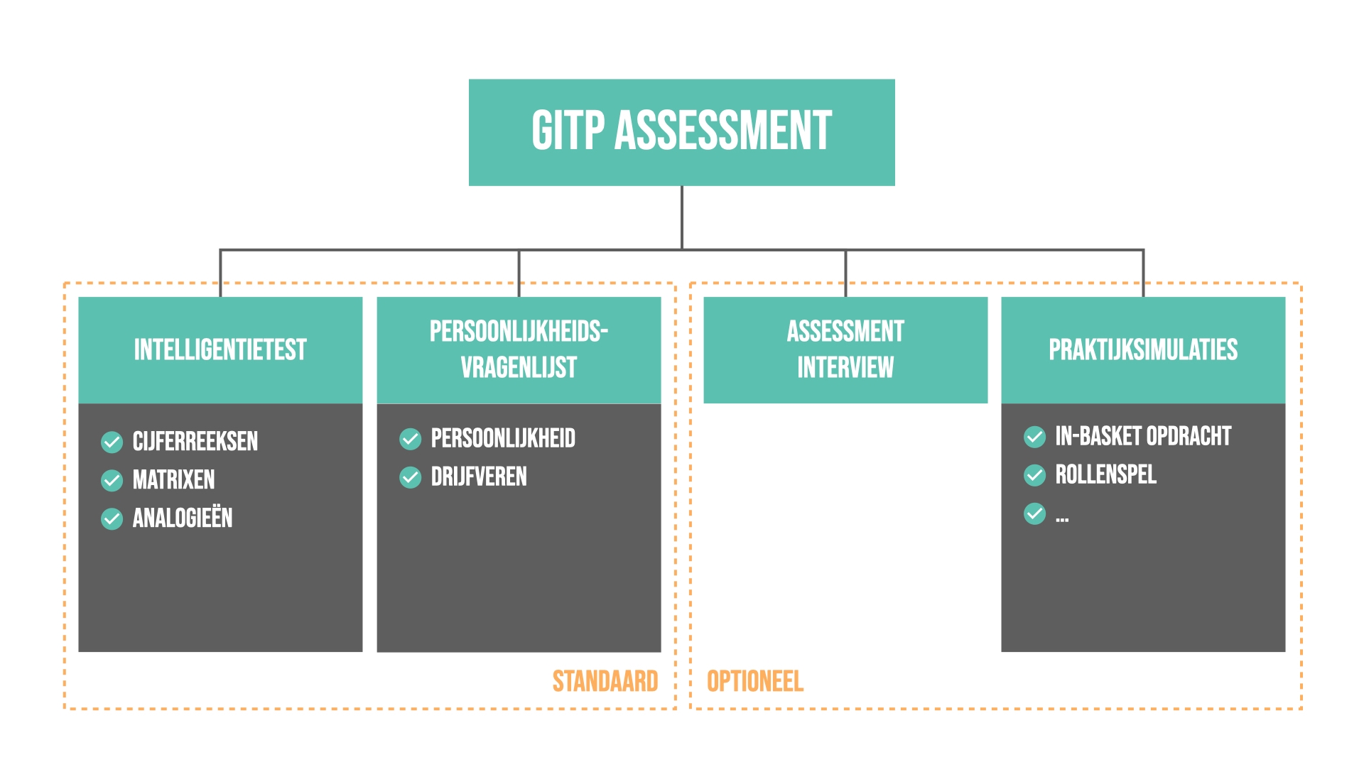 Toch bestaat er niet zoiets als “het GITP assessment”. Het GITP assessment is geen one-size-fits-all assessment, maar een modulair assessment. Men stemt het aantal onderdelen en de moeilijkheidsgraad af op de eisen die aan bepaalde functie worden gesteld. En dat is ook niet zo gek, want aan elke baan of functie worden andere eisen gesteld. Een management functie vraagt om management vaardigheden en een commerciële functie om commerciële vaardigheden.